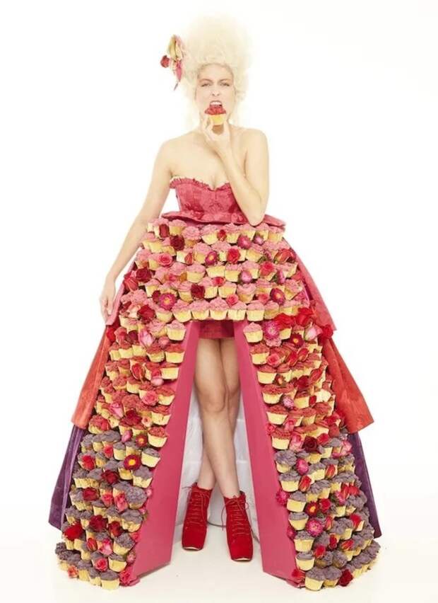 For Food Network UK, a Marie Antoinette-inspired dress, designed by Janis Morrison, made up of 300 fairy cakes (British cupcakes), from Rosalind Miller Cakes, was commissioned and displayed in London’s Icetank Studio, on September 17, 2013, in order to celebrate Food Network’s Cupcake Fashion Showcase.